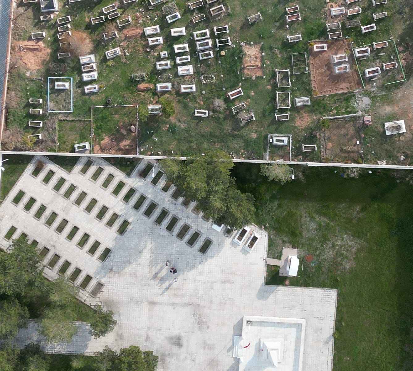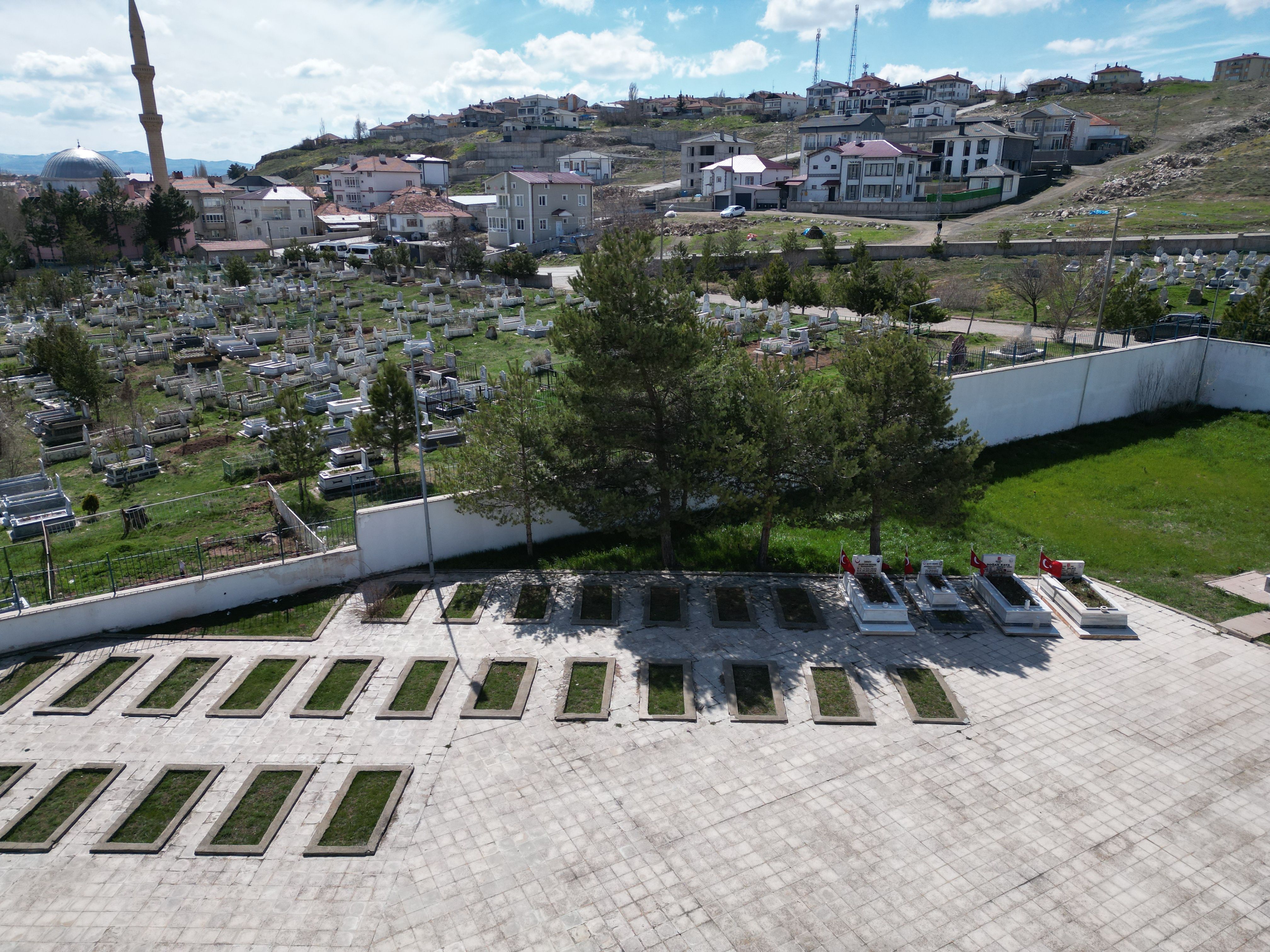 Pusula ile yapılan kontrollerde Garnizon Şehitliği’ndeki mezar yerlerinin kıbleye uygun düzenlendiği dikkat çekerken, hemen yanındaki sivil mezarların yönlerinin değişiklik gösterdiği görüldü. Kıble yönlerinin özellikle şehitlikten farklı olduğu gözlenen mezarlar, dronla havadan görüntülendi.