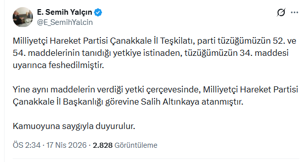 Yalçın Çanakkale il teşkilatı ile ilgili olarak ise “Milliyetçi Hareket Partisi Çanakkale İl Teşkilatı, parti tüzüğümüzün 52. ve 54. maddelerinin tanıdığı yetkiye istinaden, tüzüğümüzün 34. maddesi uyarınca feshedilmiştir. Yine aynı maddelerin verdiği yetki çerçevesinde, Milliyetçi Hareket Partisi Çanakkale İl Başkanlığı görevine Salih Altınkaya atanmıştır. Kamuoyuna saygıyla duyurulur.” paylaşımını yaptı.