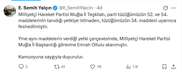 Yalçın’ın paylaşımı şöyle: “Milliyetçi Hareket Partisi Muğla İl Teşkilatı, parti tüzüğümüzün 52. ve 54. maddelerinin tanıdığı yetkiye istinaden, tüzüğümüzün 34. maddesi uyarınca feshedilmiştir. Yine aynı maddelerin verdiği yetki çerçevesinde, Milliyetçi Hareket Partisi Muğla İl Başkanlığı görevine Emrah Oltulu atanmıştır. Kamuoyuna saygıyla duyurulur.”