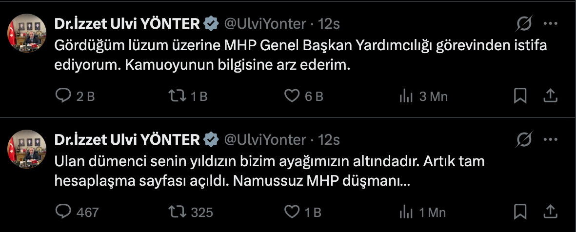 Yönter bu paylaşımından kısa bir süre sonra yine X hesabından paylaştığı kısa açıklamada, “Gördüğüm lüzum üzerine MHP Genel Başkan Yardımcılığı görevinden istifa ediyorum. Kamuoyunun bilgisine arz ederim,” ifadelerini kullandı.