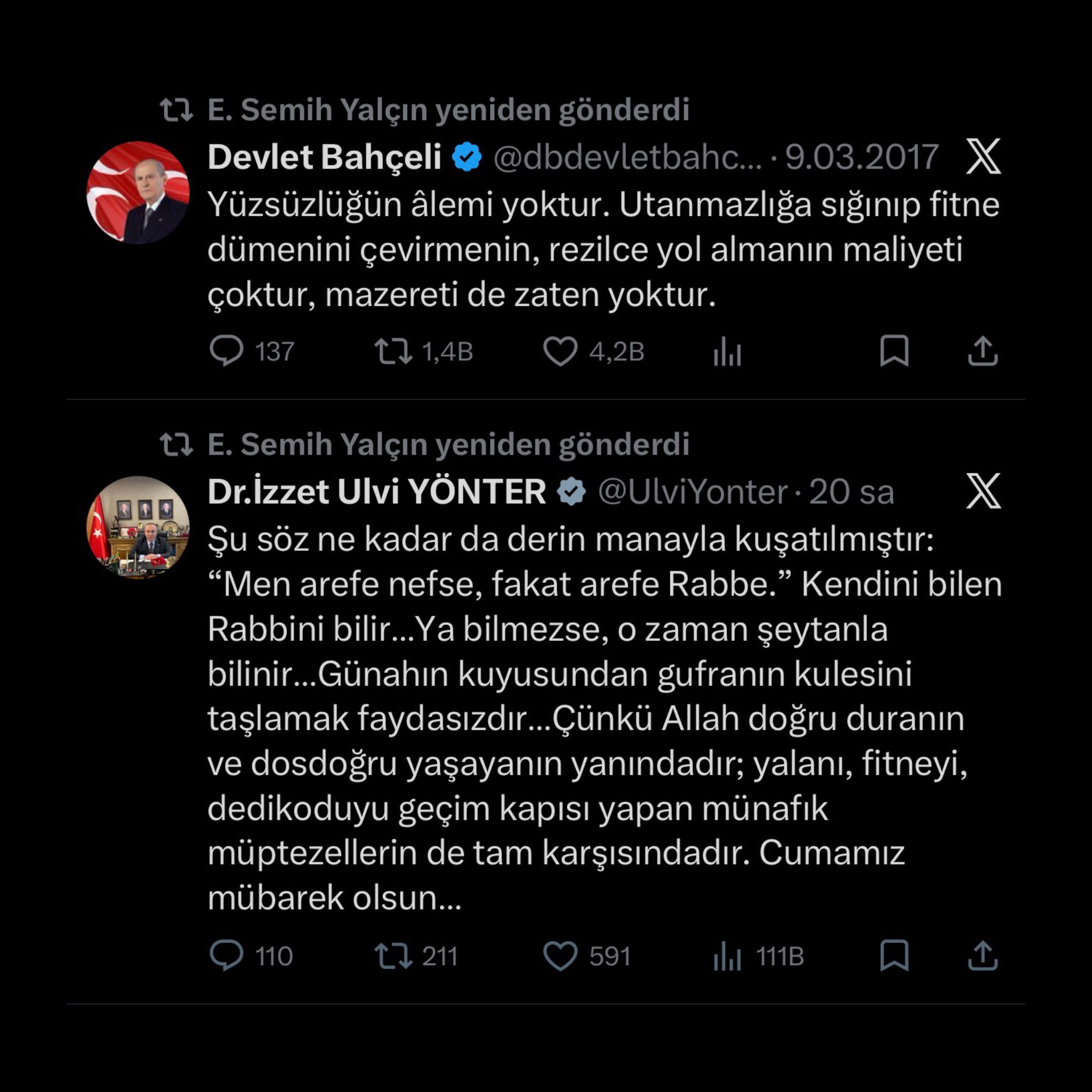 Bu paylaşımdan bir süre sonra MHP Genel Başkan Yardımcısı Semih Yalçın, istifa eden İzzet Ulvi Yönter’in ve Devlet Bahçeli’nin 2017 yılındaki paylaşımlarını yeniden paylaştı;
