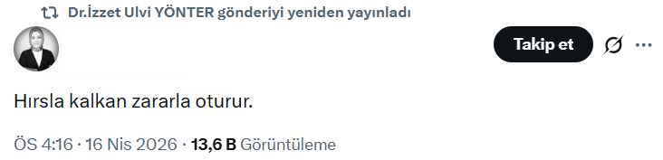 Yönter’in yeniden gönderi yaptığı paylaşımda “Hırsla kalkan zararla oturur” ifadeleri yer aldı.