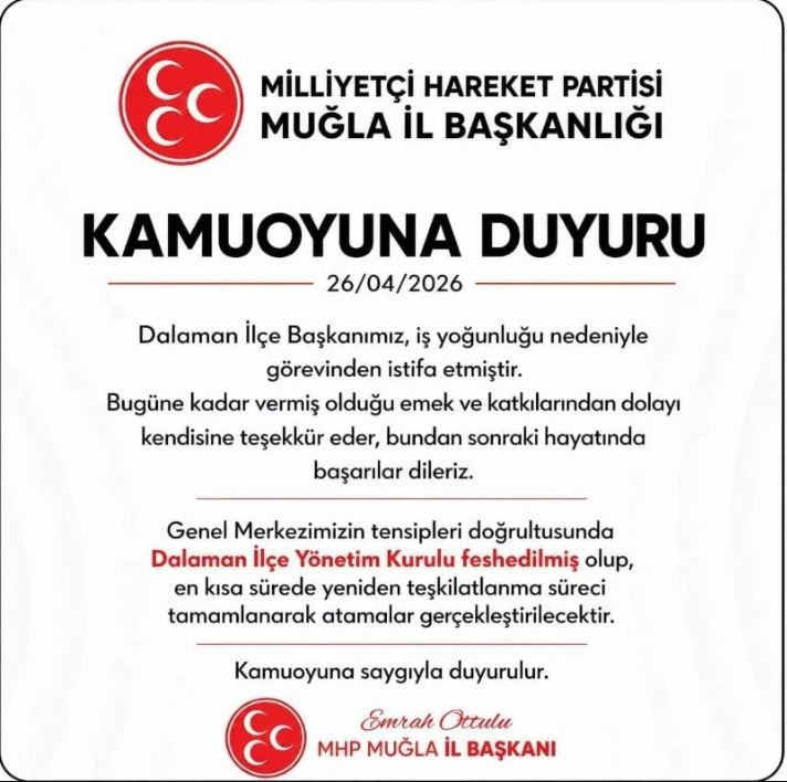 “Yürütmekte olduğum Milliyetçi Hareket Partisi Dalaman İlçe Başkanlığı görevimi, artan iş yoğunluğum sebebiyle üzülerek bırakma kararı almış bulunuyorum. Görev sürem boyunca birlikte yol yürüdüğüm tüm dava arkadaşlarıma, teşkilat mensuplarımıza ve kıymetli hemşehrilerimize gönülden teşekkür ediyorum. Bu süreçte üzerimizde hakkı olan herkesten helallik diliyor, varsa bilmeden, istemeden kırdığımız gönüller için af ve özür diliyorum. Liderimiz Devlet Bahçeli beyefendinin izinde, kutlu davamıza olan bağlılığımın ömür boyu süreceğini, her zaman bu davanın bir neferi olmaktan onur ve gurur duyacağımı özellikle ifade etmek isterim.”
