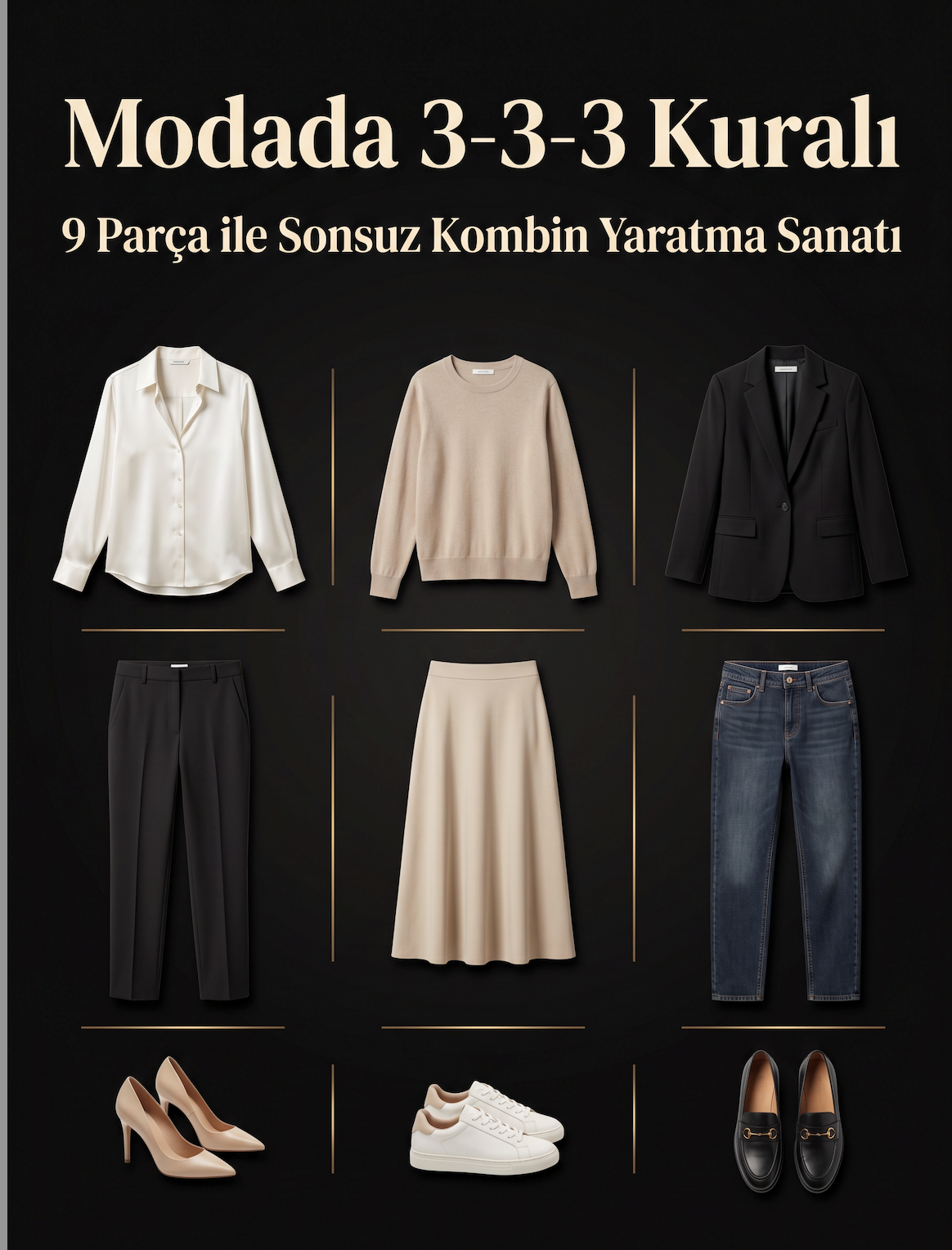 • Adım 4: Katmanlama ve Aksesuarların Gücünü Kullan! 3-3-3 kuralı sadece 9 parçadan ibaret değil. Bu temel gardırobu ceketler, şallar, kemerler ve takılar gibi aksesuarlarla zenginleştirerek kombin sayını katlayabilirsin. Aksesuarlar, en basit kombini bile anında kişiselleştirir.