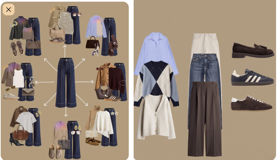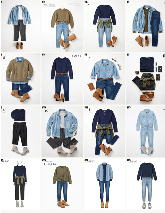Giyinmeyi kolaylaştıran bu kural, özellikle seyahatler için adeta bir kurtarıcıdır. Sadece 9 parça ile 2 haftalık bir tatili veya evdeki 15 günü birbirinden şık kombinlerle geçirebilirsin. İşte sana ilham verecek bir örnekle 15 farklı kombin oluşturma adımları: