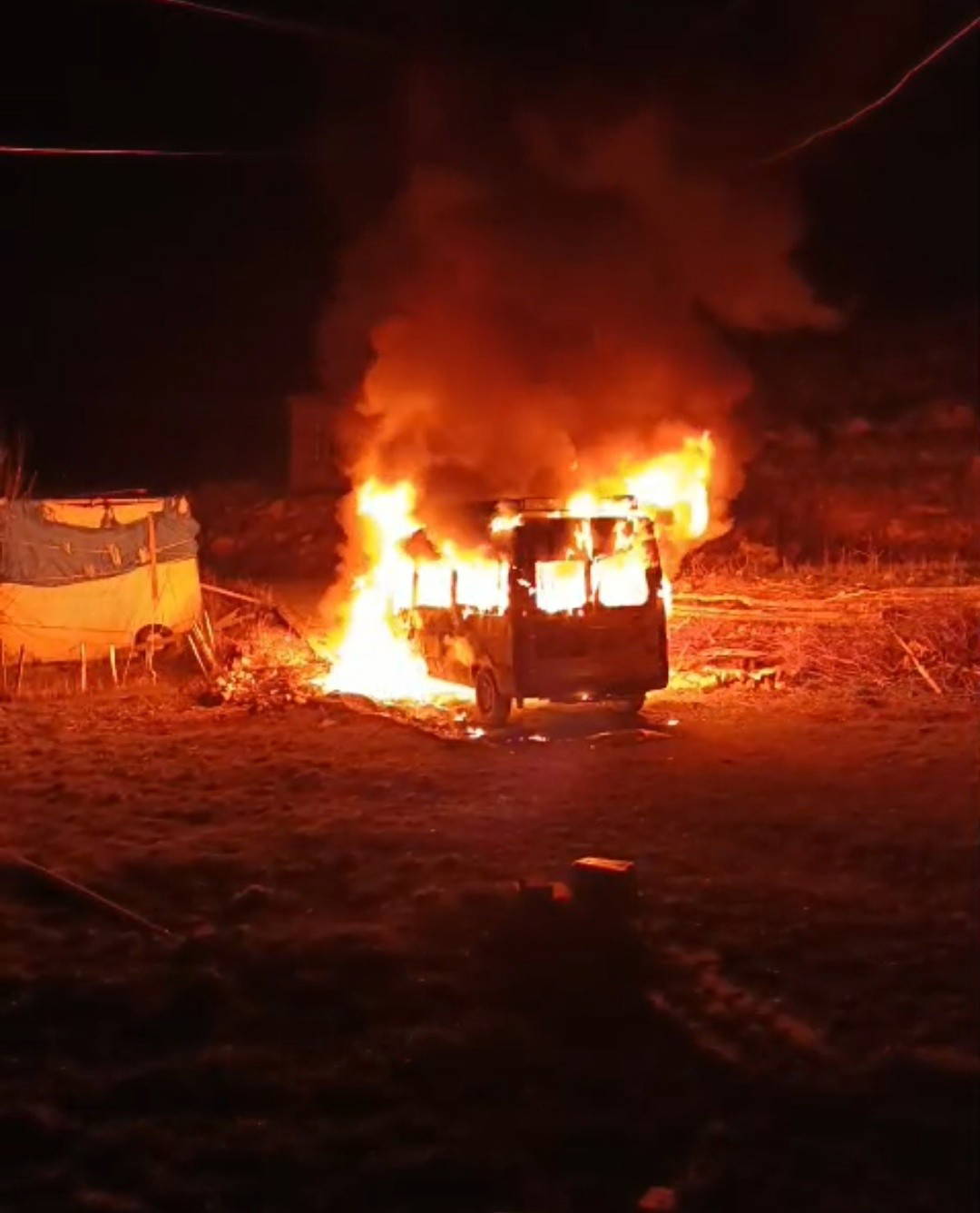 Iğdır’ın Tuzluca ilçesine bağlı Katırlı köyünde, muhtar Hanifi Kızıltaş’a ait köy servisi ve öğrenci servisi olarak da kullanılan minibüs gece saatlerinde henüz bilinmeyen bir nedenle alev aldı.