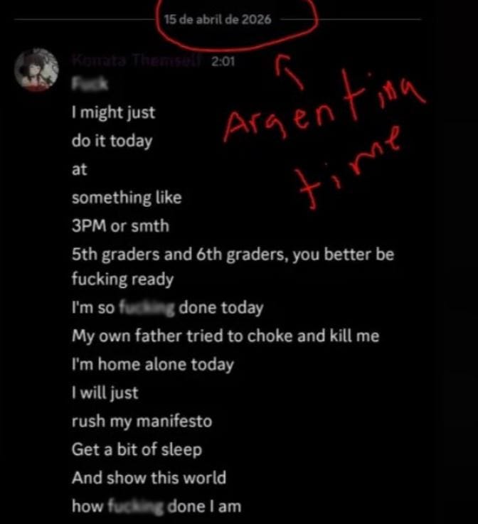 “5. ve 6. sınıflar, gerçekten hazır olsanız iyi olur. Bugün gerçekten tamamen bittim. Kendi babam beni boğmaya ve öldürmeye çalıştı. Sadece manifestomu hızlıca tamamlayacağım. Biraz uyuyacağım ve bu dünyaya göstereceğim ne kadar tükenmiş olduğumu.”