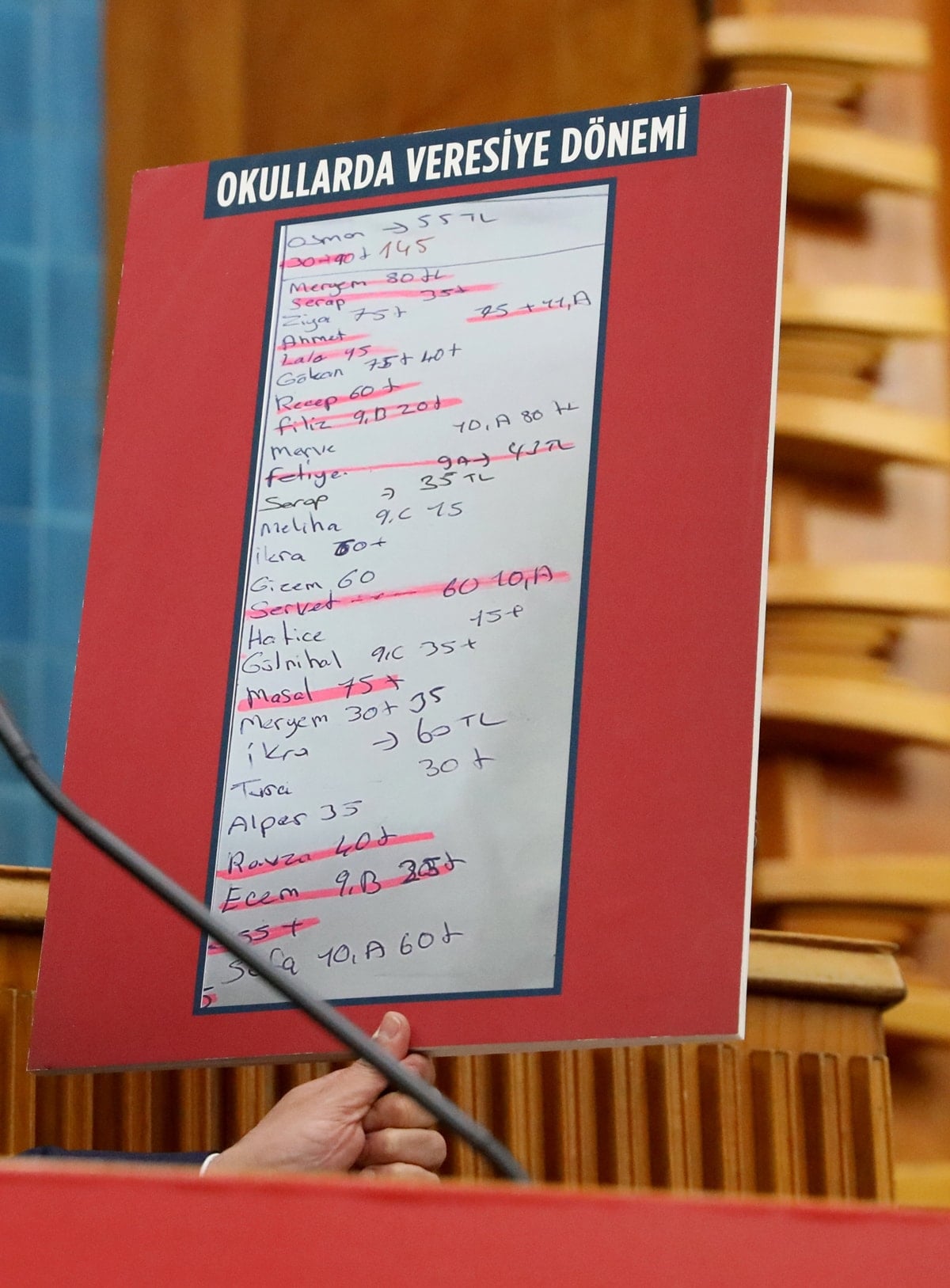 Özel partisinin grup toplantısında kürsüye elinde bir okulun kantin veresiye defteri ile çıkan Özel şunları söyledi: “Gerçekten okuldaki veresiye defterini, insan 11-A’daki Ziya’nın 75 liralık borcunu, Lara’nın 15 liralık borcunu, 9-B’deki Filiz’in 20 liralık borcunu, 9- A’daki Fethiye’nin 43 liralık borcunu görünce ne diyeceğini şaşırıyor. Bu ülkenin kantinlerinde, bu ülkenin evladına bir kaşarlı tost alamayacak kişiye tostu yarımdan kesip 50 liraya bir çocuğa tost verildiğini, onun da veresiye kaydedildiğini görüyorsunuz. Evlatlarımızı veresiye defterlerine düşürenleri sonra da bir tarafta kendi sefalarınızı sürenleri, bu milletin elinden hiçbir şey kurtaramayacak, hiçbir şey kurtaramayacak.”