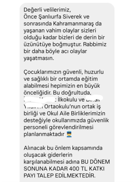 Söz konusu mesajda, bu kapsamda oluşacak giderlerin karşılanabilmesi adına velilerden “400 TL katlı payı” istendi.