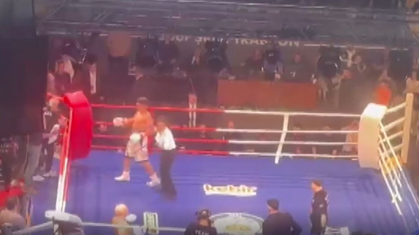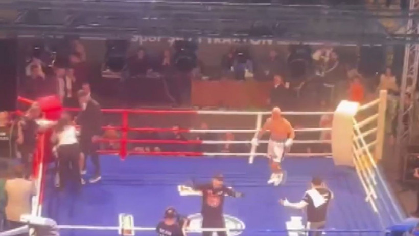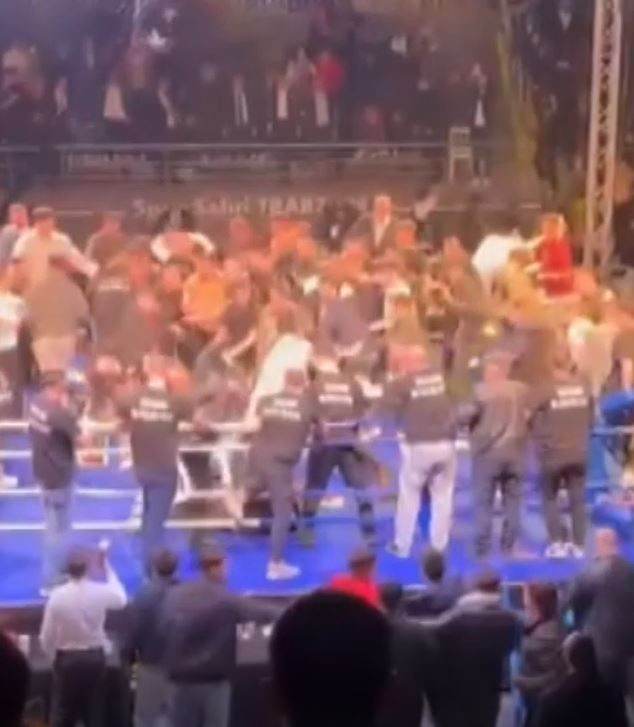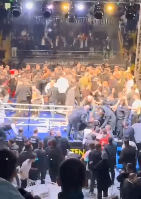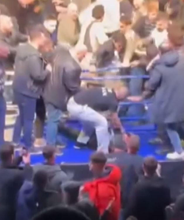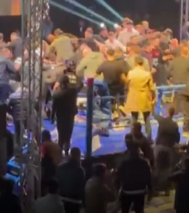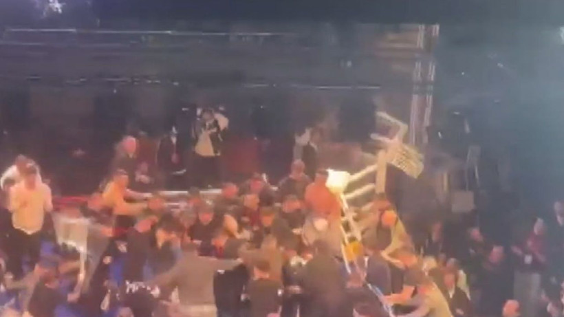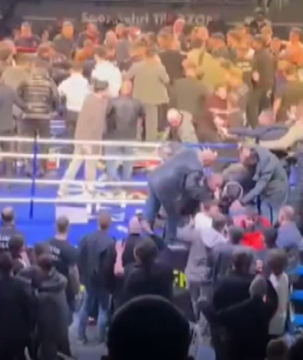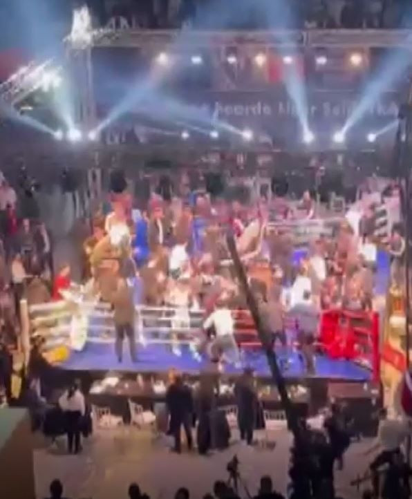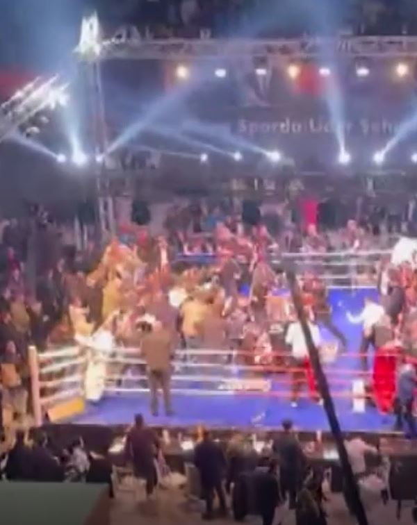 Görüntülerde; ringe plastik sandalyelerin fırlatıldığı, tekme ve yumruklarla birbirlerine giren kalabalığa görevlilerin güçlükle müdahale etmeye çalıştığı, salon hoparlörlerinden de sakin olunması yönünde anonslar yapıldığı anlar yer aldı.
