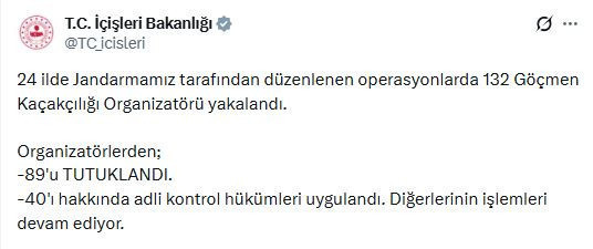 Bakanlığın sanal medya hesabından yapılan açıklamaya göre, Jandarma Genel Komutanlığı Göçmen Kaçakçılığı ve İnsan Ticareti ile Mücadele Daire Başkanlığı koordinesinde 24 ilde hava destekli operasyonlar düzenlendi. İl jandarma komutanlıkları ve jandarma komando timleri tarafından yapılan çalışmalar sonucu, 132 insan kaçakçılığı organizatörü yakalandı.