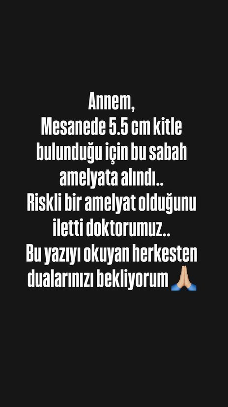 “Annem şu an çok riskli bir ameliyata giriyor. Mesanesinde 5.5 santimlik bir kitle tespit edildi. Tüm sevenlerimizden ve dostlarımızdan dua bekliyoruz.”