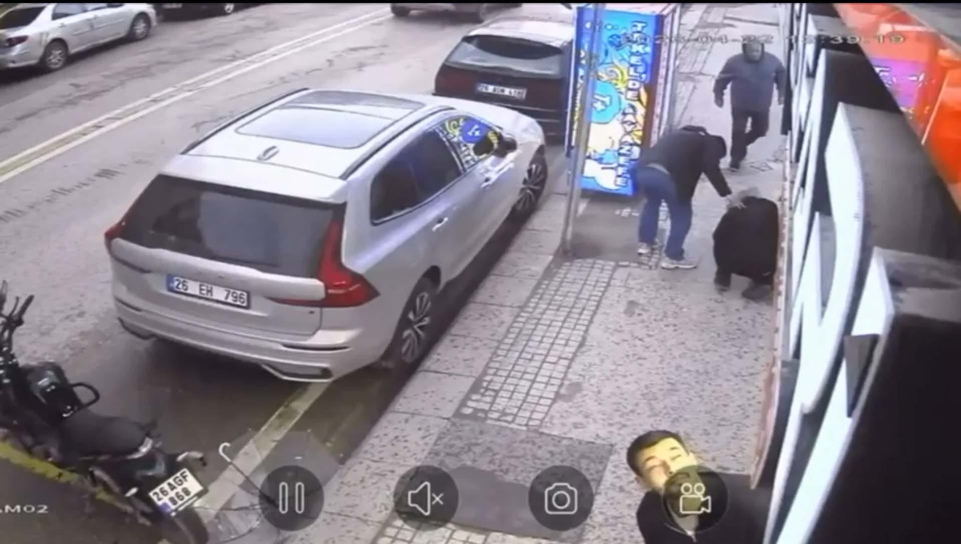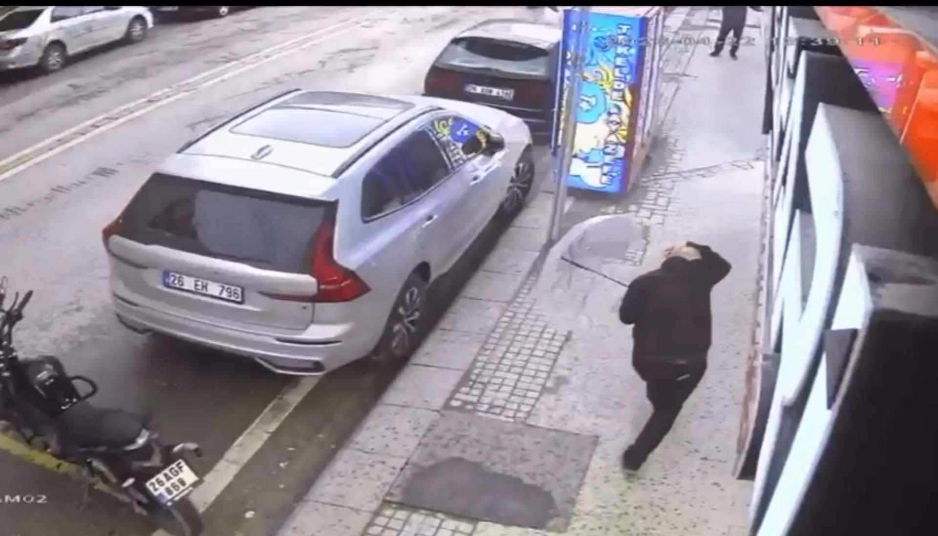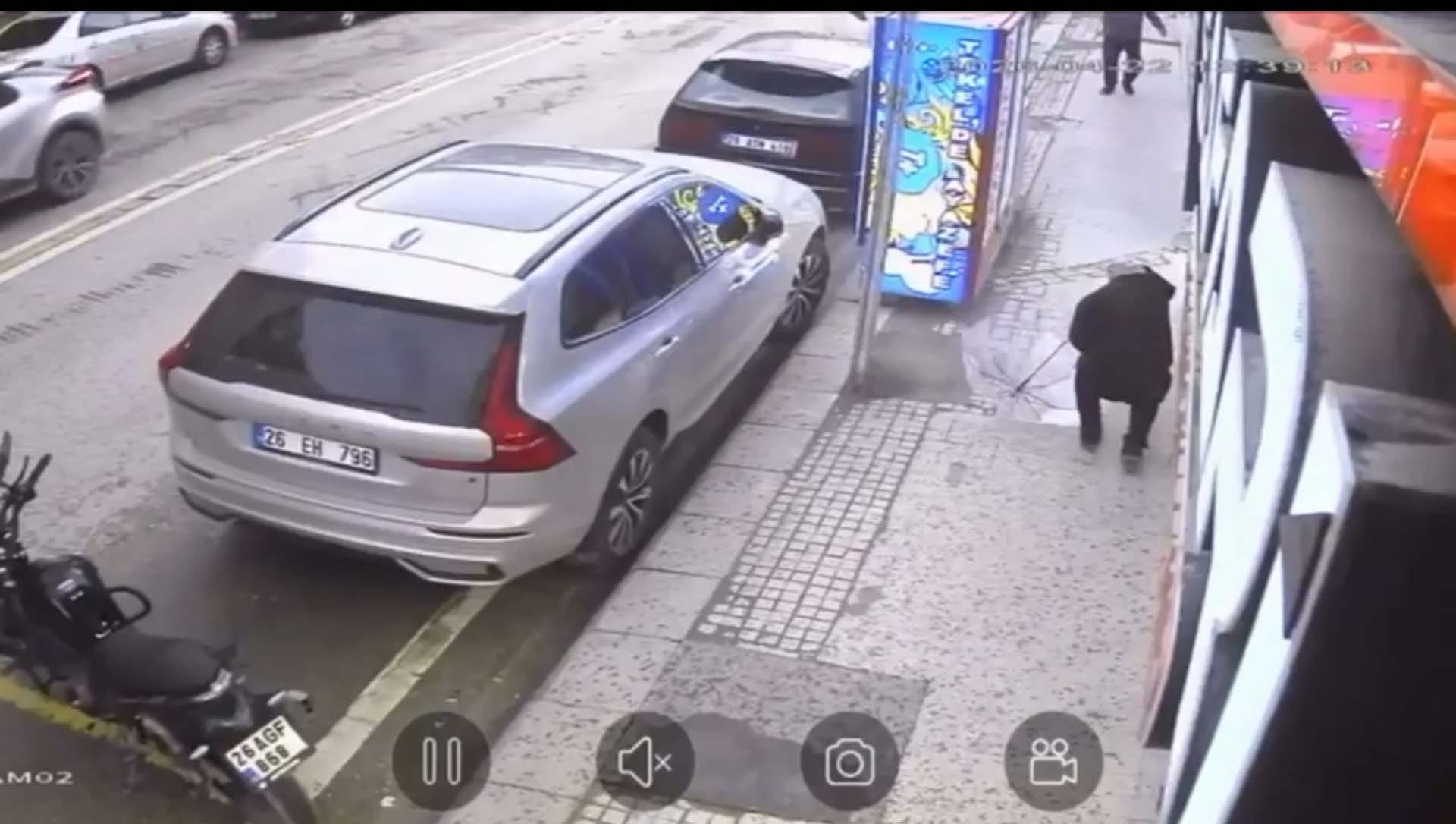 Yaşananlar bir iş yerinin güvenlik kamerasına yansıdı. Görüntülerde, şeffaf şemsiye ile kaldırımda yürüyen Emre Candemir’in başına cam parçalarının düştüğü anlar yer aldı. (DHA)
