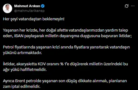 Arıkan, sosyal medya hesabından yaptığı açıklamada, “Her şeyi vatandaştan beklemeyin! Yaşanan her krizde, her doğal afette vatandaşlarımızdan yardım talep eden, IBAN paylaşarak milletin dayanışma duygusuna başvuran iktidar; Petrol fiyatlarında yaşanan krizi anında fiyatlara yansıtarak vatandaşın yükünü artırmaktadır. İktidar, akaryakıtta KDV oranını yüzde 1’e düşürerek milletin üzerindeki bu ağır yükü hafifletmelidir. Ayrıca Brent petrolde yaşanan son düşüş dikkate alınmalı, planlanan zam iptal edilmelidir.” ifadesini kullandı.