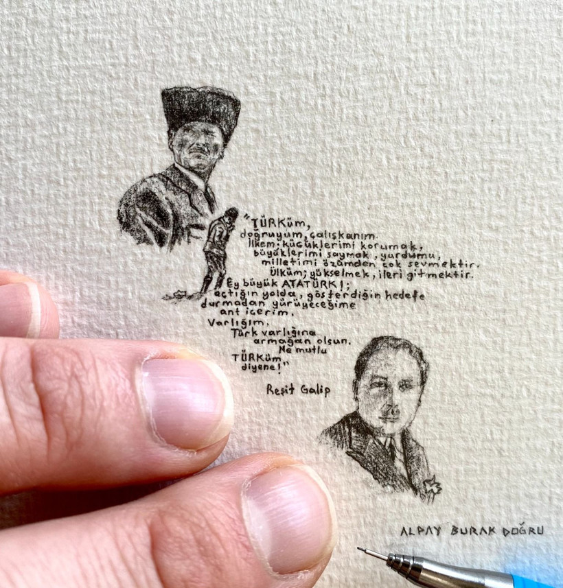 “Mikroskopla çalışmaya başladığımda sakal teli üzerine İstiklal Marşı’mızı, ardından da Atatürk’ün Gençliğe Hitabesi’ni yazmak istiyorum. Bilinen en tatlı canlılardan olan karıncanın yüzüne büyüteç ile ya da mikroskop altında baktığınız zaman tıbbi mikro ressamlık ve mikro resim sanatıyla neden eser ürettiğimin cevabını kısmen de olsa verebilirim.”