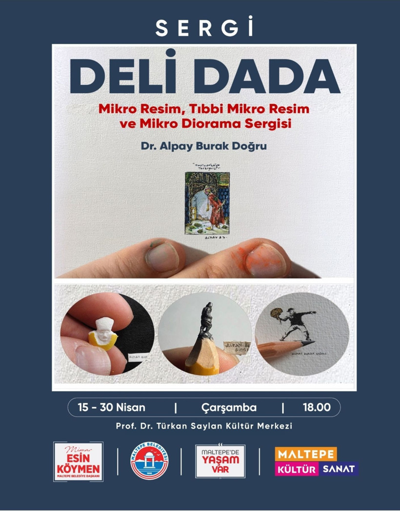 Çanakkale Onsekiz Mart Üniversitesi (ÇOMÜ) Tıp Fakültesi Hastanesi Beyin ve Sinir Cerrahisi Bölümü Araştırma Görevlisi Dr. Alpay Burak Doğru’nun “Mikro Tıp Ressamlığı ve Mikro Ressamlık” tekniğiyle yara bandı, hap, kabak çekirdeği gibi objeler üzerine yaptığı, sadece büyüteçle görülebilen eserlerden oluşan kişisel sergisi “Deli Dada” Mikro Resim, Tıbbi Mikro Resim ve Mikro Diorama, 15 Nisan saat 18.00’de İstanbul Maltepe’deki Prof. Dr. Türkan Saylan Kültür Merkezi’nde açılacak ve 30 Nisan’a kadar devam edecek.