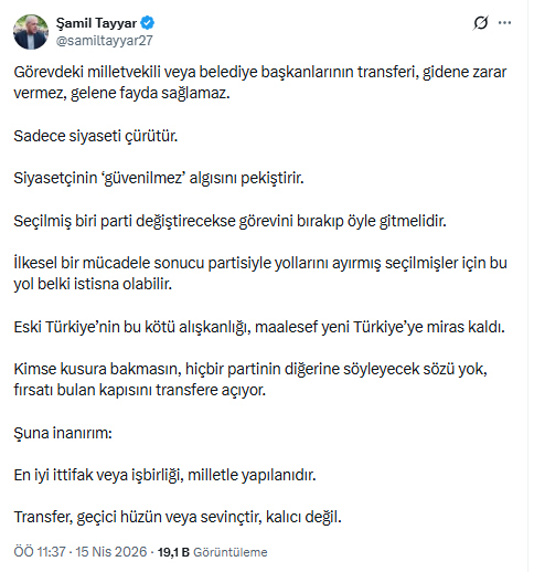 Görevdeki milletvekili veya belediye başkanlarının transferi, gidene zarar vermez, gelene fayda sağlamaz.