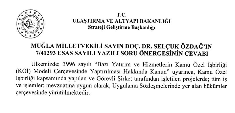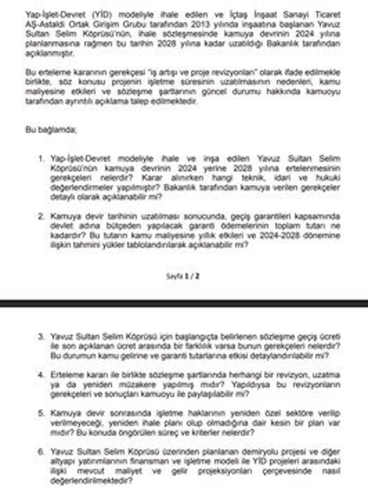 “Yavuz Sultan Selim Köprüsü’nün kamuya devrinin neden 2024’ten 2028’e ertelendiğini, geçiş garantilerinin bütçeye getireceği milyarlarca liralık yükü, sözleşme revizyonlarını ve yeniden ihale planlarını tam 6 maddeyle tek tek sorduk. Yasal süresi geçtikten sonra lütfedip gönderdikleri “cevap” ise, iktidarın milli iradeye olan saygısını göstermesi bakımından ibretlik şekilde şu cümlede tezahür etmektedir: