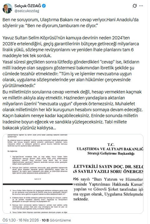 Eski AKP’li Selçuk Özdağ, Ulaştırma Bakanı Abdulkadir Uraloğlu’na Yavuz Sultan Selim Köprüsü’nün kamuya devrinin neden 2024’ten 2028’e ertelendiğini, geçiş garantilerinin bütçeye getireceği milyarlarca liralık yükü, sözleşme revizyonlarını ve yeniden ihale planlarını tam 6 maddeyle tek tek sorduğunu aktardı.
