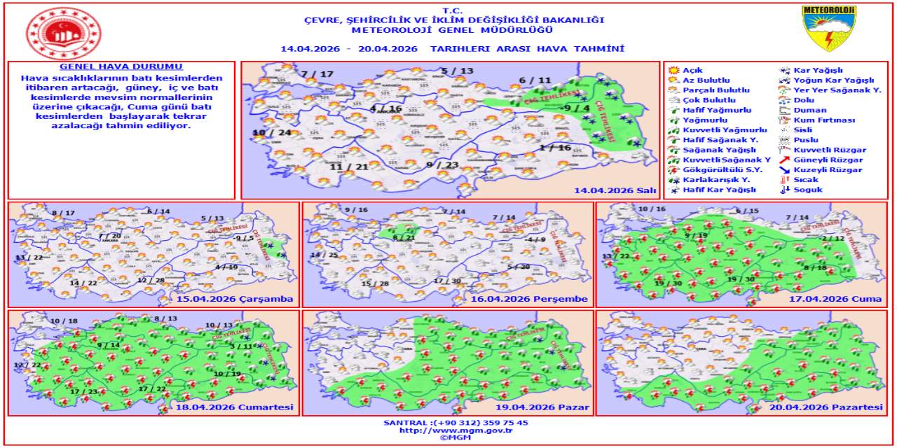 Hava sıcaklıklarının çarşamba günü itibarıyla ülkenin kuzey ve iç kesimlerinde mevsim normallerinin altına düşmesi beklenirken, güney ve batı kesimlerde sıcaklıkların mevsim normallerinin üzerinde seyredeceği tahmin ediliyor. Rüzgarın ise genel olarak güneyli yönlerden eseceği, ancak Doğu ve Güneydoğu Anadolu’nun doğusunda kuvvetli kuzeyli rüzgarların etkili olacağı belirtiliyor.
