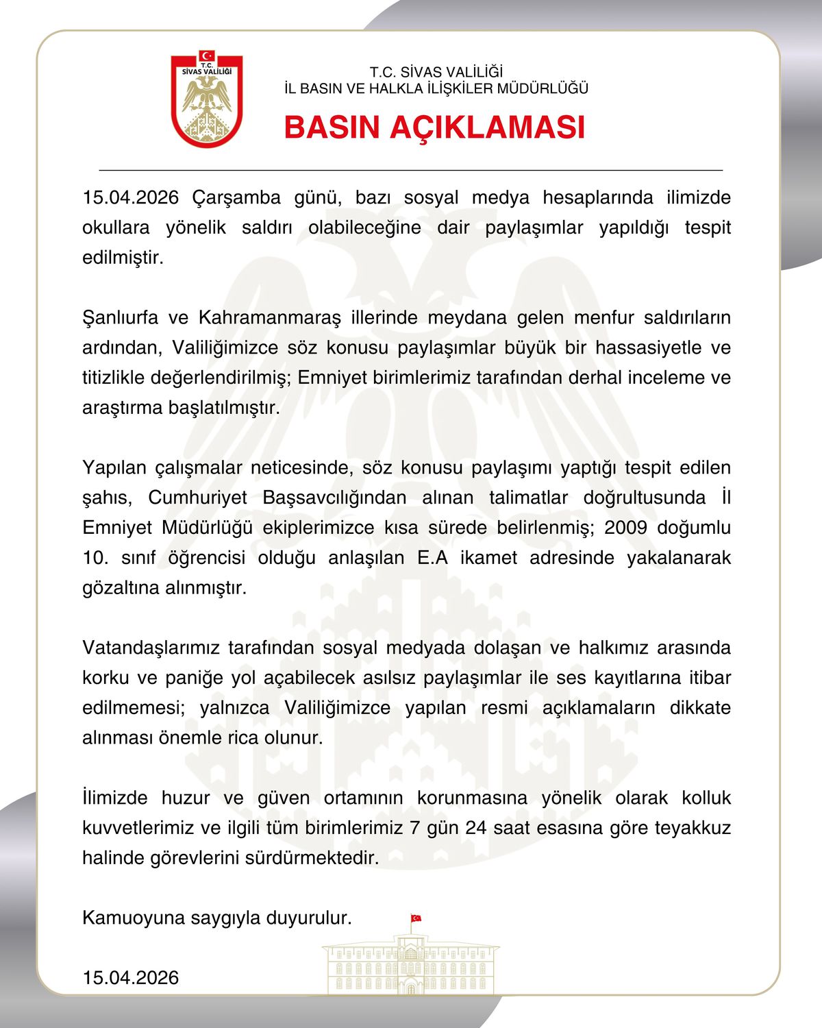 Sivas Valiliği konuyla alakalı resmi sanal medya hesabından basın açıklaması yaptı. Açıklamada, “15.04.2026 Çarşamba günü, bazı sosyal medya hesaplarında ilimizde okullara yönelik saldırı olabileceğine dair paylaşımlar yapıldığı tespit edilmiştir. Şanlıurfa ve Kahramanmaraş illerinde meydana gelen menfur saldırıların ardından, Valiliğimizce söz konusu paylaşımlar büyük bir hassasiyetle ve titizlikle değerlendirilmiş; Emniyet birimlerimiz tarafından derhal inceleme ve araştırma başlatılmıştır. Yapılan çalışmalar neticesinde, söz konusu paylaşımı yaptığı tespit edilen şahıs, Cumhuriyet Başsavcılığından alınan talimatlar doğrultusunda İl Emniyet Müdürlüğü ekiplerimizce kısa sürede belirlenmiş; 2009 doğumlu 10’uncu sınıf öğrencisi olduğu anlaşılan E.A. ikamet adresinde yakalanarak gözaltına alınmıştır. Vatandaşlarımız tarafından sosyal medyada dolaşan ve halkımız arasında korku ve paniğe yol açabilecek asılsız paylaşımlar ile ses kayıtlarına itibar edilmemesi; yalnızca Valiliğimizce yapılan resmi açıklamaların dikkate alınması önemle rica olunur. İlimizde huzur ve güven ortamının korunmasına yönelik olarak kolluk kuvvetlerimiz ve ilgili tüm birimlerimiz 7 gün 24 saat esasına göre teyakkuz halinde görevlerini sürdürmektedir” ifadelerine yer verildi.