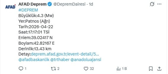 AFAD tarafından yapılan açıklamada, Ağrı Patnos’da 4.3 büyüklüğünde bir deprem meydana geldiği açıklandı. Açıklamada, depremin derinliğinin 13,43 km olduğu belirtildi.