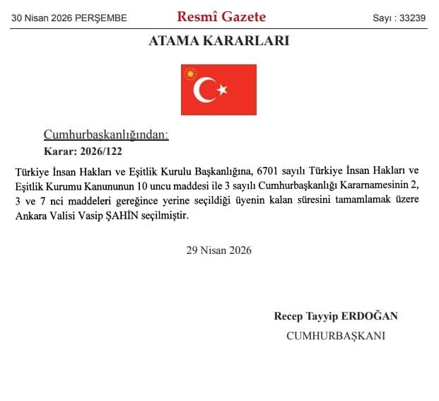 Aydın Valisi Yakup Canbolat, Ankara Valiliğine atanırken, Ankara Valisi Vasip Şahin ise Türkiye İnsan Hakları ve Eşitlik Kurulu Başkanlığı’na seçilmiştir.