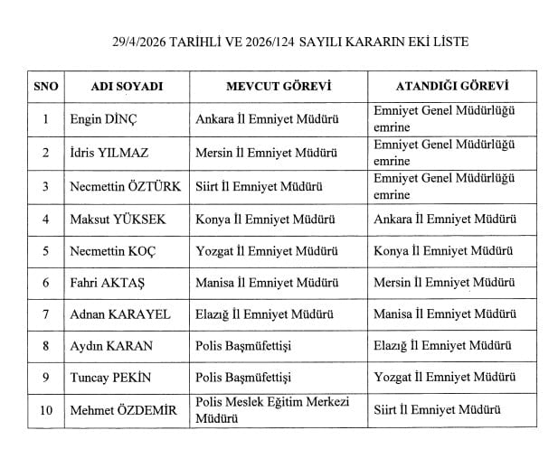 İl Emniyet Müdürlüklerine yapılan atamalar ise şöyle;