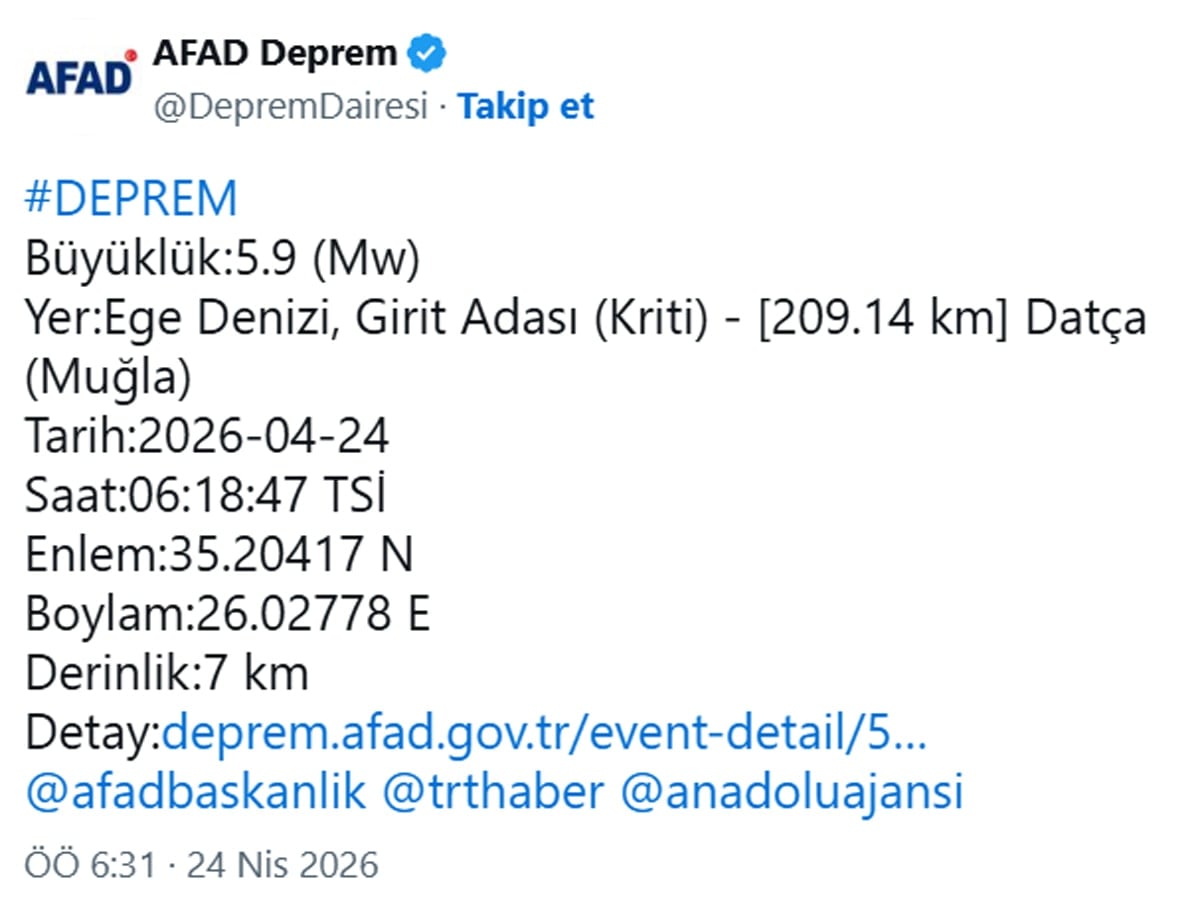 Ege Denizi’nde sabah saatlerinde deprem meydana geldi. AFAD tarafından yapılan açıklamaya göre deprem Girit Adası açıklarında oldu. Datça’ya 209,14 km uzaklıktaki depremin büyüklüğü 5.9 olarak duyuruldu.