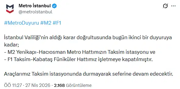 Buna göre, Taksim istasyonunda seferler ikinci bir duyuruya kadar kapatıldı. Bu doğrultuda M2 Metro Hattındaki Taksim istasyonu ve F1 Taksim-Kabataş Füniküler Hattı işletmeye kapatıldı.