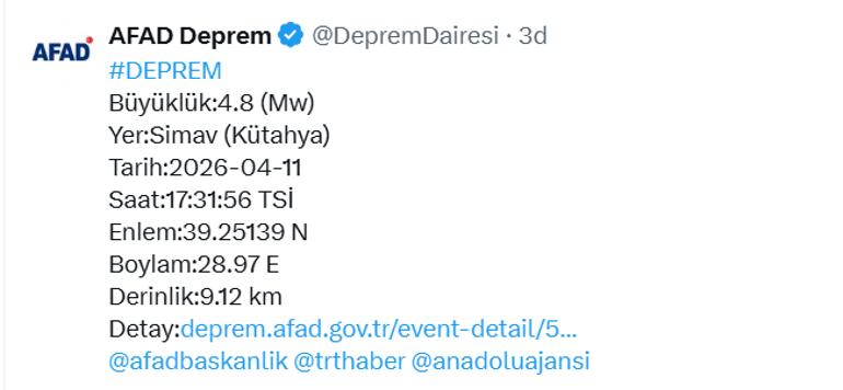 Simav’da 4.8 büyüklüğünde depremin ardından, 3.2 ve 3.7 büyüklüğünde 2 deprem daha meydana geldi.