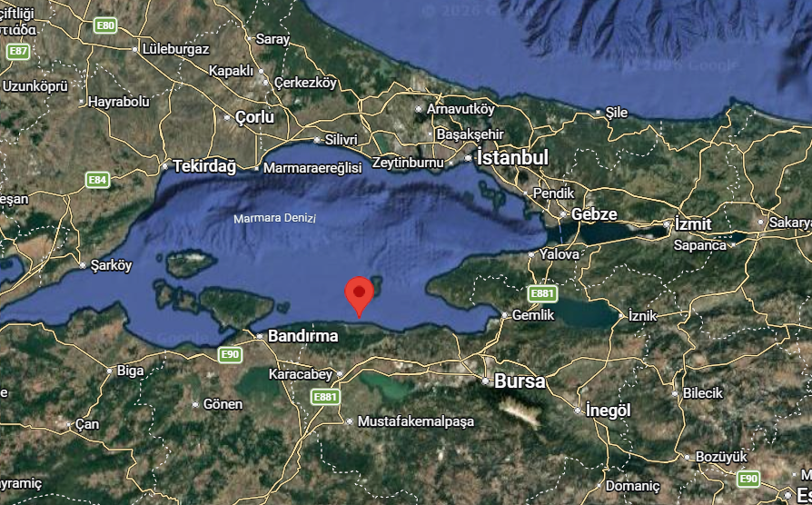 Marmara Denizi’nde, Bursa’nın Karacabey ilçesi açıklarında 14 Nisan 2026 Pazartesi günü saat 15:42’de 3.8 büyüklüğünde bir deprem meydana geldi. Kandilli Rasathanesi verilerine göre sarsıntının merkez üssü yaklaşık olarak 40.429° kuzey enlemi ve 28.4498° doğu boylamı olarak kaydedildi.
