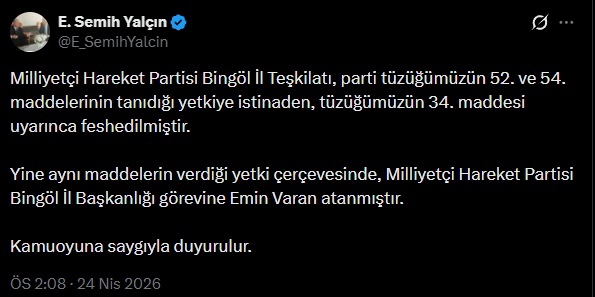 Semih Yalçın, X’ten yaptığı paylaşımda, “Milliyetçi Hareket Partisi Bingöl İl Teşkilatı, parti tüzüğümüzün 52. ve 54. maddelerinin tanıdığı yetkiye istinaden, tüzüğümüzün 34. maddesi uyarınca feshedilmiştir. Yine aynı maddelerin verdiği yetki çerçevesinde, Milliyetçi Hareket Partisi Bingöl İl Başkanlığı görevine Emin Varan atanmıştır. Kamuoyuna saygıyla duyurulur” ifadelerini kullandı.