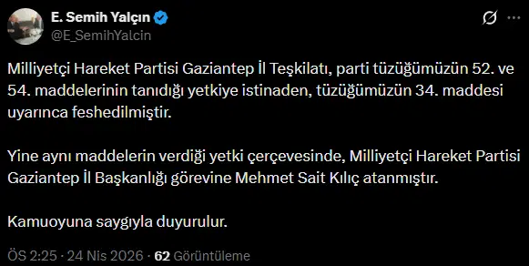 Yalçın, bir diğer paylaşıma ise “Milliyetçi Hareket Partisi Gaziantep İl Teşkilatı, parti tüzüğümüzün 52. ve 54. maddelerinin tanıdığı yetkiye istinaden, tüzüğümüzün 34. maddesi uyarınca feshedilmiştir. Yine aynı maddelerin verdiği yetki çerçevesinde, Milliyetçi Hareket Partisi Gaziantep İl Başkanlığı görevine Mehmet Sait Kılıç atanmıştır. Kamuoyuna saygıyla duyurulur” notunu düştü.
