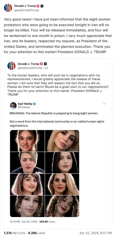 ABD Başkanı Donald Trump, sosyal medya hesabından yaptığı paylaşımda, İran’daki 8 kadın protestocunun idam edilmeyeceğini açıkladı. Trump, paylaşımında, “Çok iyi haber! Az önce İran’da bu gece idam edilecek olan sekiz kadın protestocunun artık öldürülmeyeceği bilgisi bana ulaştı. Dördü derhal serbest bırakılacak, dördü ise bir ay hapis cezasına çarptırılacak. İran’ın ve liderlerinin, Amerika Birleşik Devletleri Başkanı olarak talebime saygı duyarak planlanan idamı iptal etmelerini çok takdir ediyorum. Bu konuya gösterdiğiniz ilgi için teşekkür ederim” ifadelerine yer verdi.
