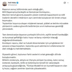 MHP Genel Başkan Yardımcısı Feti Yıldız, ‘Terörsüz Türkiye’ hedefi kapsamında TBMM’de kurulan Milli Dayanışma, Kardeşlik ve Demokrasi Komisyonu’nun raporuna ilişkin, “Komisyonumuz, Türkiye’nin barışla, bütünlükle, demokrasiyle ve kardeşlikle güçleneceğini göstermiştir.