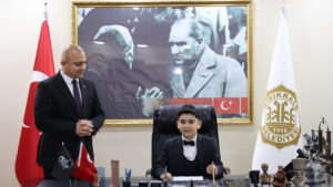 Kırıkkale’de 23 Nisan Ulusal Egemenlik ve Çocuk Bayramı kapsamında düzenlenen temsili makam devir tesliminde, Mehmet Uzelli İlkokulu 3. sınıf öğrencisi Bulut Ali Arlıer, Belediye Başkanı Av. Ahmet Önal’dan belediye başkanlığı koltuğunu devraldı.