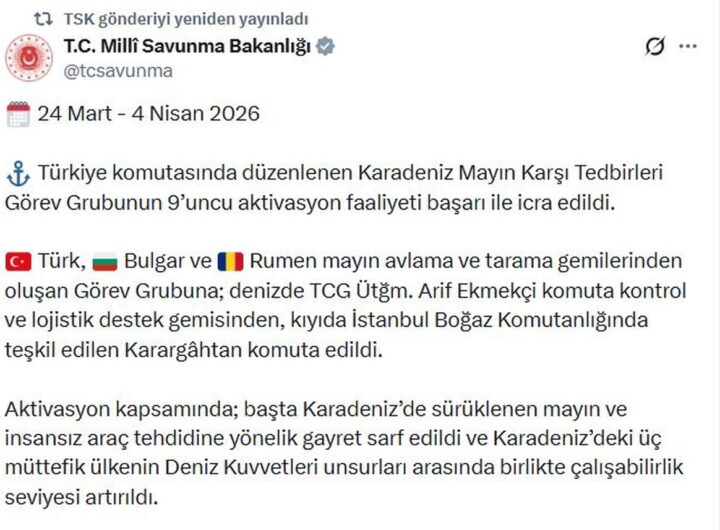 Karadeniz’de Mayın Karşı Tedbirleri Başarıyla Gerçekleşti Eğitim Karadeniz’de Mayın Karşı Tedbirleri Başarıyla Gerçekleşti Hakan Kaplan 7 Nisan 2026 MSB, Türkiye komutasıyla düzenlenen 9. Mayın Karşı Tedbirleri faaliyeti başarıyla icra edildi.Read More