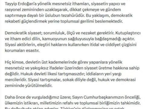 İLETİŞİM Başkanı Burhanettin Duran, “CHP Genel Başkanı Özgür Özel’in Cumhurbaşkanımız Sayın Recep Tayyip Erdoğan’a yönelik mesnetsiz ithamları, siyasetin yapıcı ve rasyonel zemininden uzaklaşarak, dikkat çekmeye ve gündem saptırmaya dayalı bir üslubun tezahürüdür.