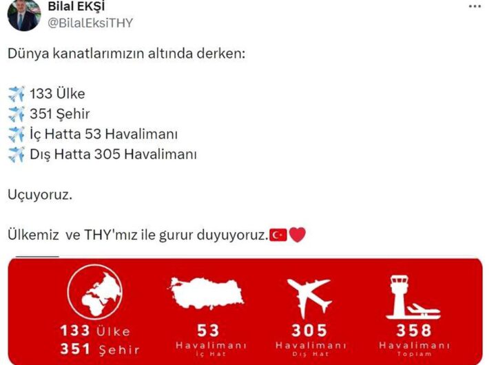 THY 358 Havalimanına Uçuş Düzenliyor Haber THY 358 Havalimanına Uçuş Düzenliyor Hakan Kaplan 5 Nisan 2026 Türk Hava Yolları, 133 ülkede 358 havalimanına uçuş düzenliyor. Genel Müdür Ekşi gurur duyduklarını belirtti.Read More