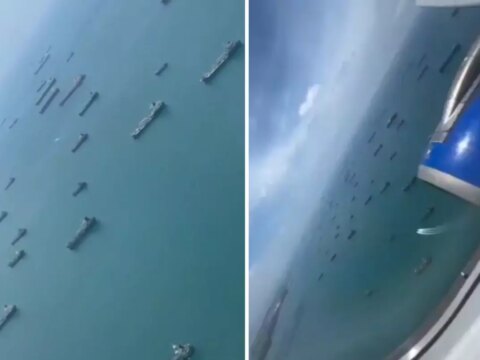 ABD-İsrail’in saldırılarına karşılık İran’ın dünya petrol ticareti için büyük önemi bulunan Hürmüz Boğazı’nı kapatması yeni bir krizi başlattı. Boğazda bekleyen gemilerin son durumu, bölgeden geçen bir uçaktan kaydedildi. Görüntülerde gemilerin sıra sıra beklediği görüldü.