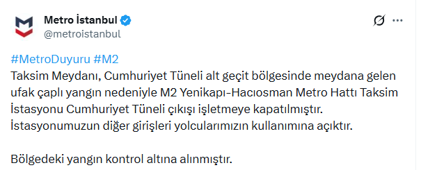 Konuya ilişkin sanal medya hesabından açıklamada bulunan Metro İstanbul A.Ş., Taksim Meydanı, Cumhuriyet Tüneli alt geçit bölgesinde meydana gelen ufak çaplı yangın nedeniyle M2 Yenikapı-Hacıosman Metro Hattı Taksim İstasyonu Cumhuriyet Tüneli çıkışı işletmeye kapatılmıştır.İstasyonumuzun diğer girişleri yolcularımızın kullanımına açıktır. Bölgedeki yangın kontrol altına alınmıştır” ifadeleri kullanıldı.