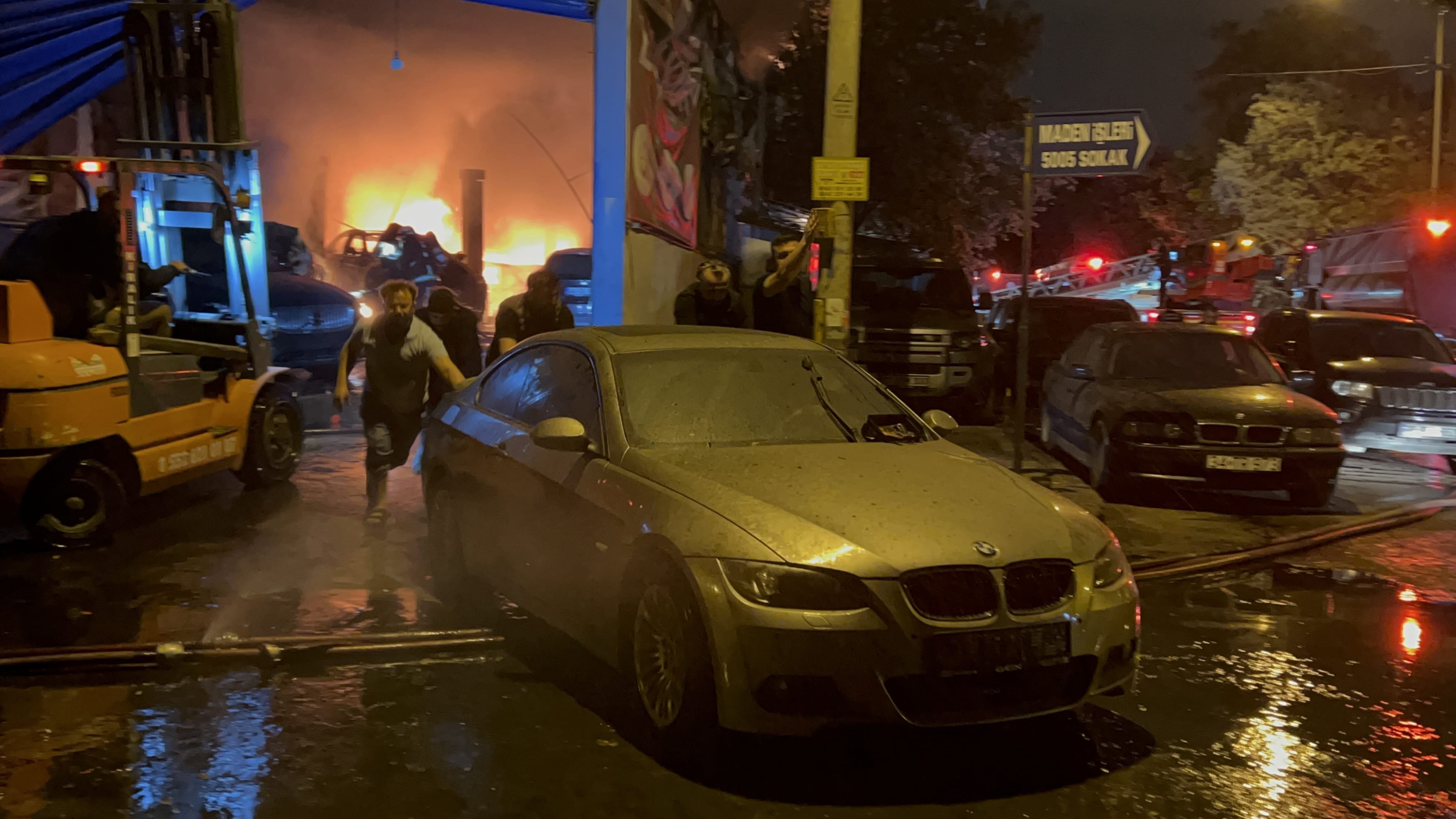 Yangın esnasında iş yeri çalışanları ve çevredekiler, içeride bulunan araçları kurtarabilmek için büyük çaba sarf etti.