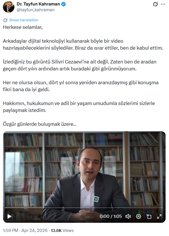 Tayfun Kahraman, yaptığı sosyal medya paylaşımında ise, “Arkadaşlar dijital teknolojiyi kullanarak böyle bir video hazırlayabileceklerini söylediler. Biraz da ısrar ettiler, ben de kabul ettim. İzlediğiniz bu görüntü Silivri Cezaevi’ne ait değil. Zaten ben de aradan geçen dört yılın ardından artık buradaki gibi görünmüyorum” ifadelerine yer verdi.