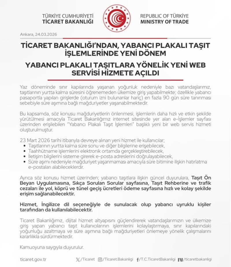 “Bu kapsamda, söz konusu mağduriyetlerin önlenmesi, işlemlerin daha hızlı ve etkin şekilde yürütülmesi amacıyla Ticaret Bakanlığımız internet sitesinde yer alan e-İşlemler sayfası üzerinden erişilebilen ‘Yabancı Plakalı Taşıt İşlemleri’ başlıklı yeni bir web servis hizmeti oluşturulmuştur.