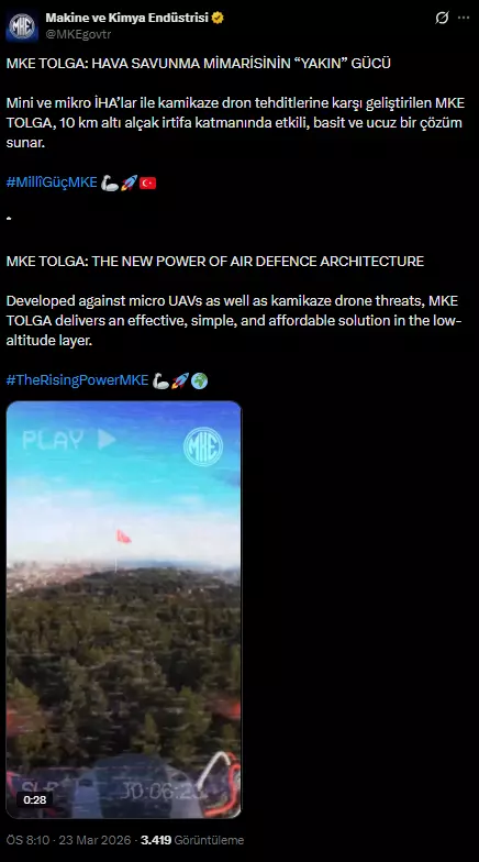 MKE’nin sosyal medya hesabından yapılan paylaşımda, “MKE TOLGA: Hava savunma mimarisinin ‘yakın’ gücü. Mini ve mikro İHA’lar ile kamikaze dron tehditlerine karşı geliştirilen MKE TOLGA, 10 kilometre altı alçak irtifa katmanında etkili, basit ve ucuz bir çözüm sunar.” ifadeleri kullanıldı.