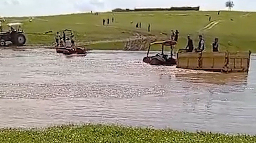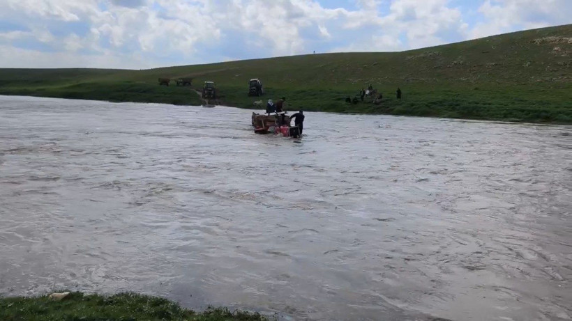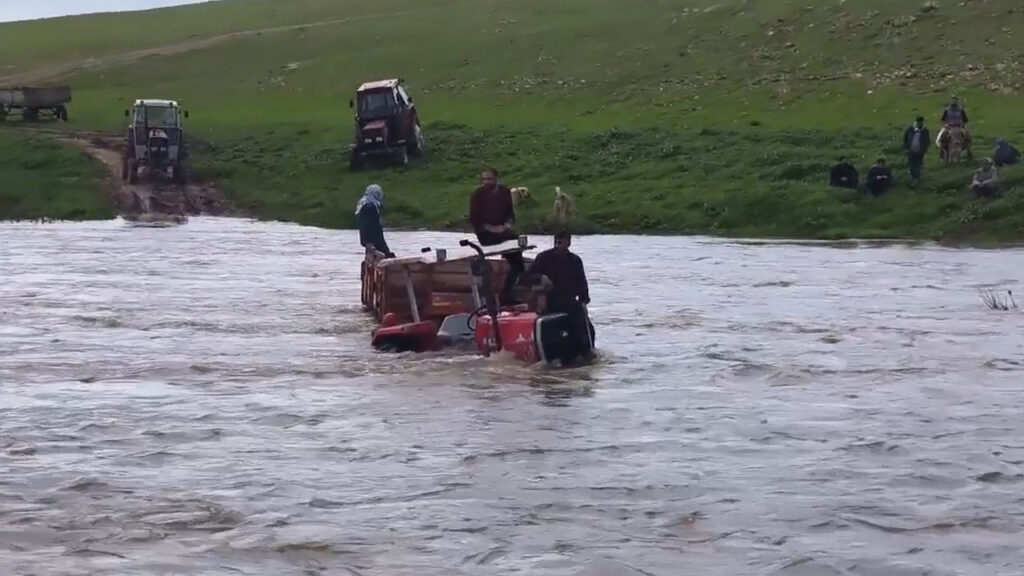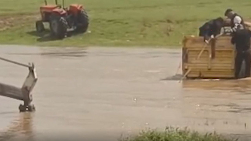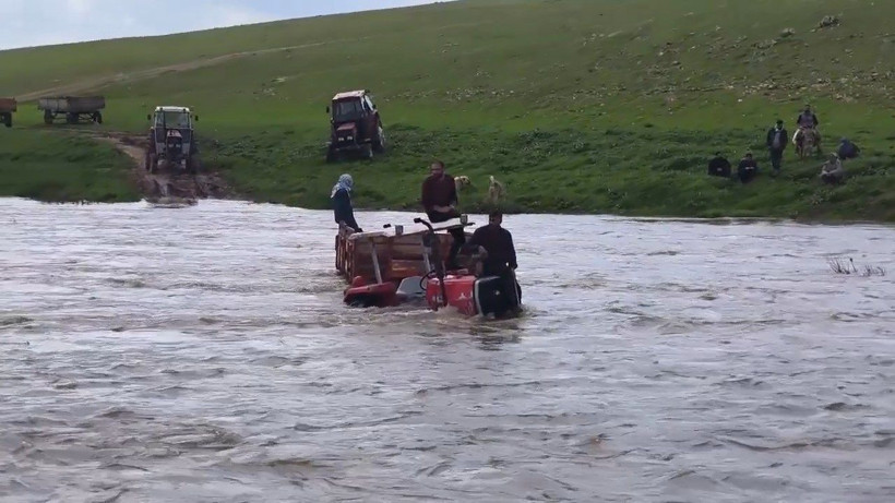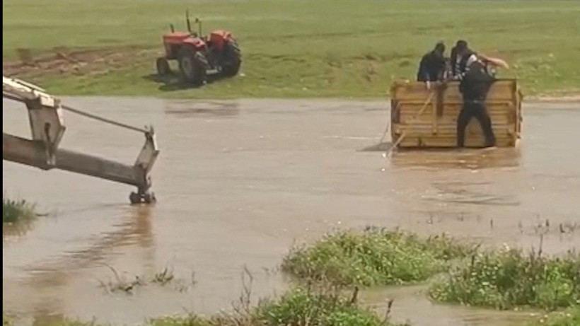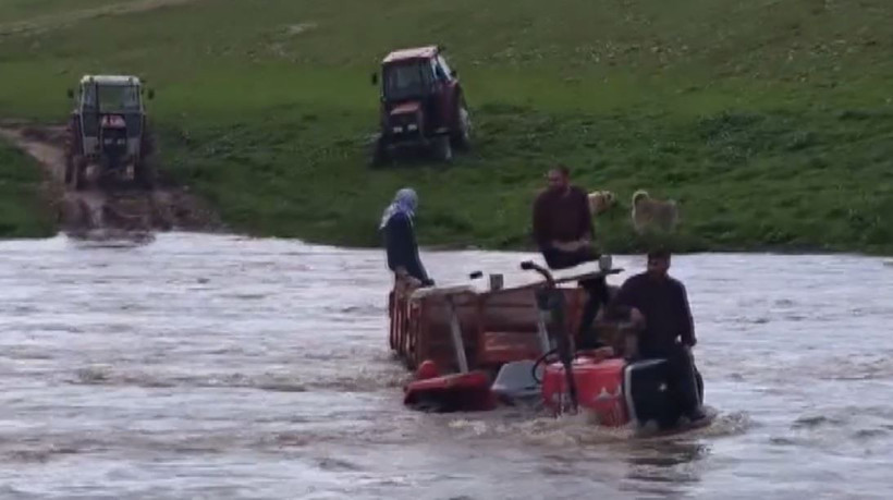 İlçede etkili olan sağanak sonrası debisi artan dereden traktörle geçmeye çalışan 3 kişi, suyun ortasında mahsur kaldı.