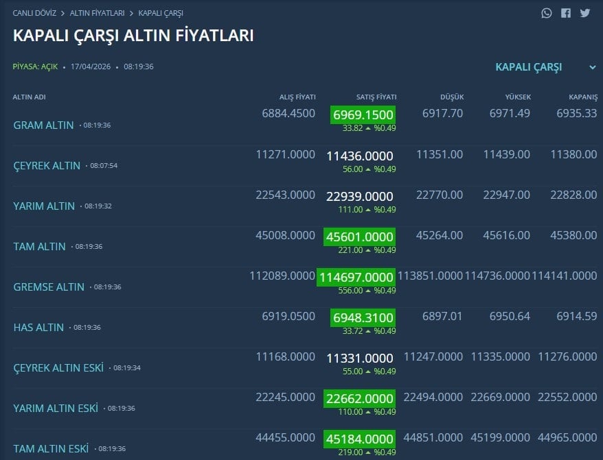 Kapalıçarşı altın fiyatları ile resmi altın fiyatları arasındaki fark devam ediyor. Kapalıçarşı’da gram altın 6 bin 969 lirada bulunuyor.