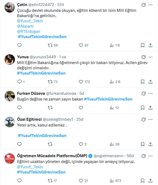 Bir kullanıcı, “Milli Eğitim Bakanlığı’na öğretmen kökenli bir bakan istiyoruz. Acilen görev değişimi olmalı” ifadeleriyle görüş bildirirken, bir başka kullanıcı ise “Bugün değilse ne zaman sayın bakan” sözleriyle tepki gösterdi.