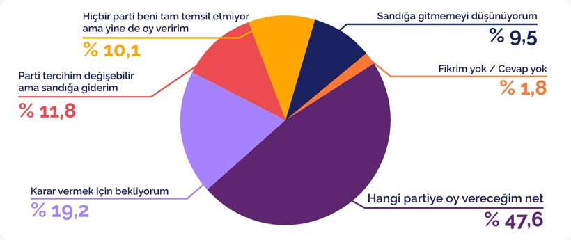 Ankete göre, seçmenlerin yaklaşık yarısı hangi partiye oy vereceği konusunda tam bir netlik içindeyken, “bekle-gör” politikasını benimseyen önemli bir kitle siyasi dengeleri değiştirebilecek potansiyele sahip.